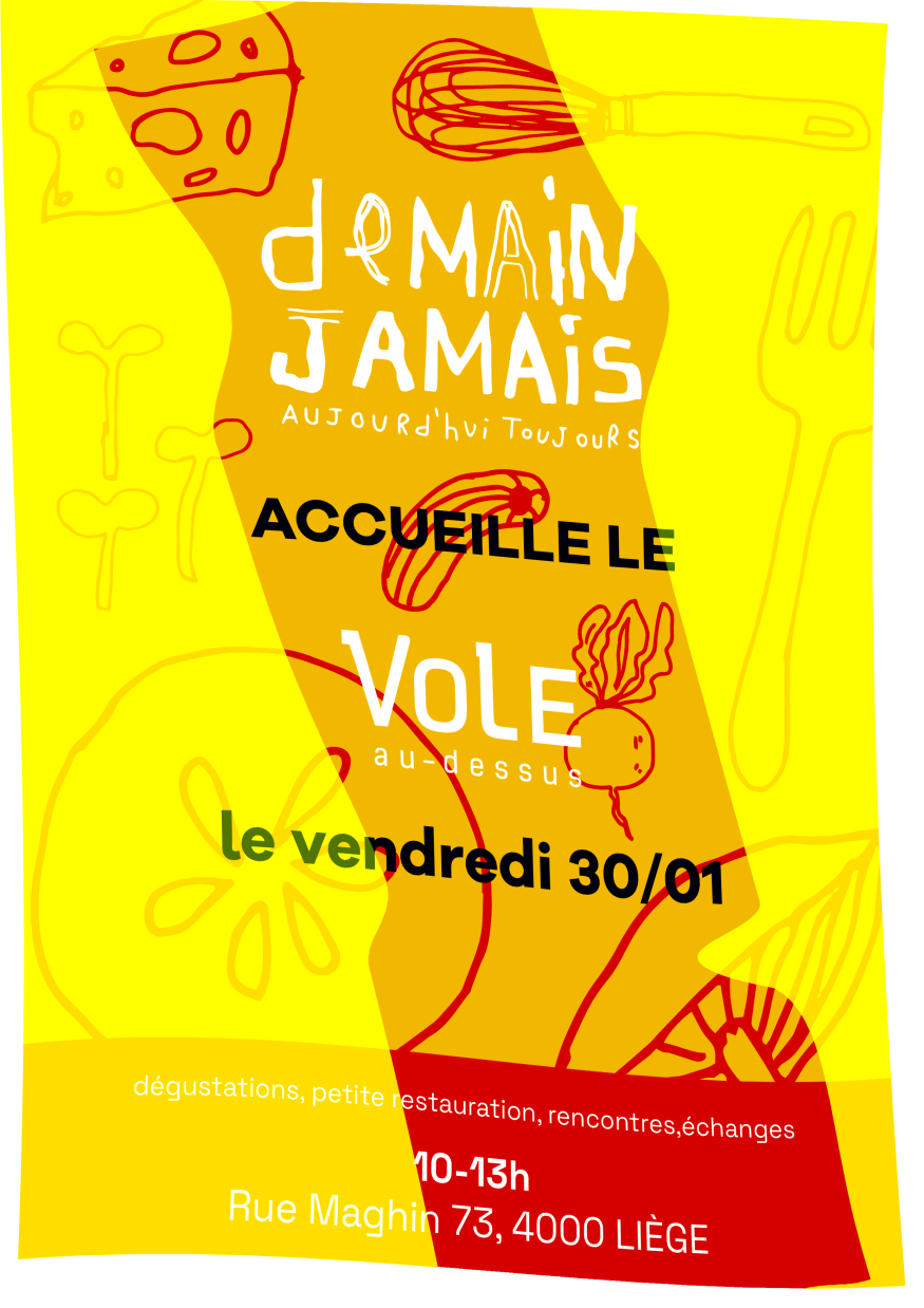 VOLE AU-DESSUS s'empare de la cuisine !!! Vendredi, de 10h à 13, dégustations, petite restauration, rencontres et échanges sont au programme. Bienvenue à toutes et tous ! Demain JamaisRue Maghin, 734000 - Liège